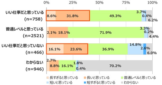 これらの結果を踏まえ、親の働く時間の長さと仕事に対する子どもからの評価をクロス分析したところ、子どもが働く時間を「長すぎると思っている」「長いと思っている」と回答した人は、子どもが自分の仕事を「いい仕事だと思っている」と回答した人にも、「いい仕事だと思っていない」と回答した人にも、合計約40%ずついる結果となりました(図表7)。このことから、親は、自分の子どもからの仕事の評価につながる要因が働く時間の長短だけではないと受けとめていることが示唆されました。