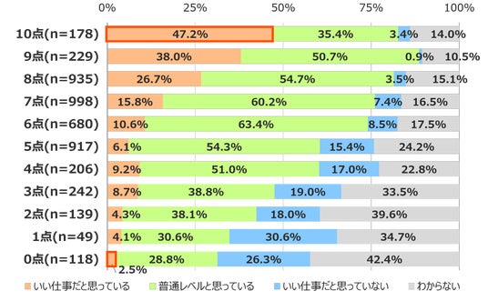 次に、子どもからの仕事への評価について、「いい仕事だと思っている」と回答した人は、生活満足度10点では47.2%に上り、生活満足度0点で2.5%に比べて約45ポイント高くなりました。また「わからない」と回答した人は、生活満足度10点で14.0%であり、生活満足度0点で42.4%と比べて約28ポイント低くなりました。これらの結果から、子どもからの仕事への評価が良い人ほど生活満足度も高い傾向にあることが示唆されました。(図表5)。