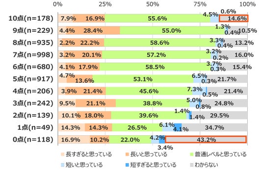 さらに、働く時間について、子どもからの評価が「わからない」と回答した人は生活満足度10点では14.6%となり、生活満足度0点の43.2%と比べて約29ポイント低くなりました。一方で、働く時間の長短については、子どもからの評価と生活満足度の間には特徴的な傾向は見られませんでした(図表6)。