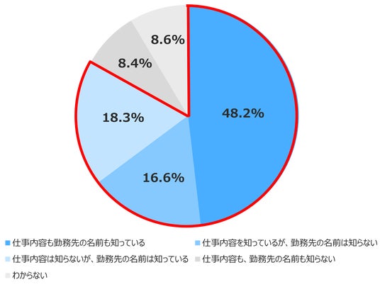 まず、子どもからの仕事の認知状況について、「仕事内容も勤務先の名前も知っている」(48.2%)を筆頭に、仕事内容または勤務先のどちらかでも知っているという回答と合わせると、83.1%の子どもが、親の仕事に対して一定の認知があるという結果になりました(図表4)。
