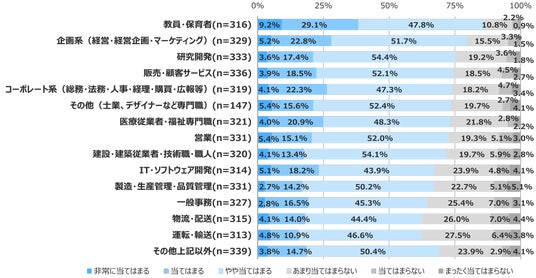 過去半年間の経験として、「子どもの生きる将来のために自分は役に立っていると思う」と回答した人(「非常に当てはまる」「当てはまる」「やや当てはまる」の合計)は、すべての職種で60%以上と高い傾向があり、子どもが10~18歳になっても、親として子どもと関わることの意義を感じていることが伺えました。一方、職種ごとに約62~86%のばらつきがみられ、業務内容などによってその意義の感じ方に差がある可能性が示唆されました(図表1)。