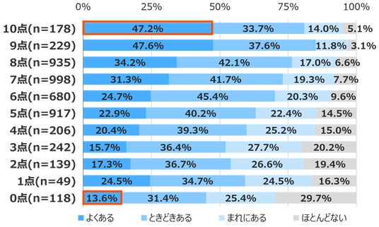 また、生活満足度(10点満点)について尋ねたところ、回答者の平均は約6.2点でした。そのうち、仕事のある平均的な一日に30分以上子どもと団らんすることが「よくある」と回答した人の割合は、生活満足度10点で47.2%となり、生活満足度0点の13.6%と比べて約34ポイント高くなりました。一方で「ほとんどない」と回答した人は、生活満足度10点で5.1%に留まり、生活満足度0点の29.7%と比べて約25ポイント低くなりました。これらの結果から、子どもとの団らんの頻度が高い人ほど生活満足度も高い傾向にあることが示唆されました(図表3)。