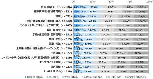 次に、過去半年間に子どもと毎朝・夜に過ごす時間を増やすために転職を検討した経験があると回答した人(「非常に当てはまる」「当てはまる」「やや当てはまる」の合計)は、約25~37%の範囲でみられました。全職種で3~4人に1人は子どもとの時間を確保するために働き方を変えることを検討したことがあり、10~18歳の子どもを持つ親に共通性のある価値志向であることが示唆されました(図表2)。