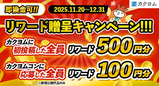 対象者・賞品対象期間中にカクヨムに初めて作品を投稿したユーザー全員:500リワード