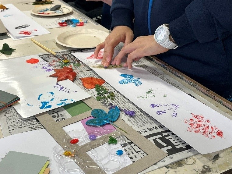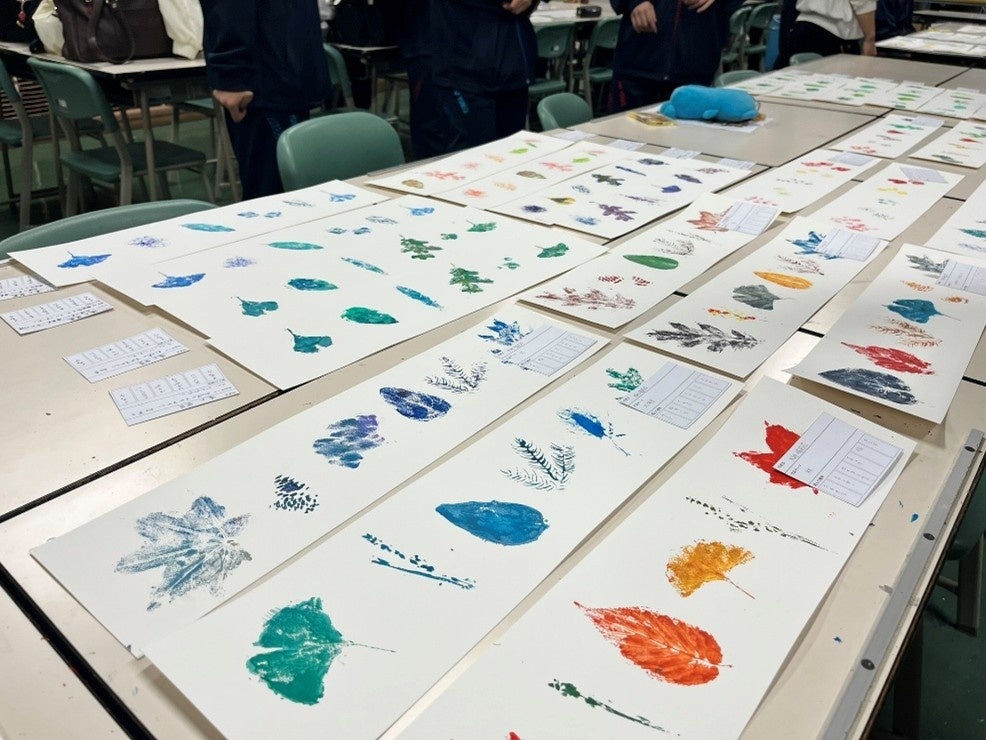 生徒たちは、自宅や学校周辺で採取した植物を用いて、「都市と自然の調和」をテーマにスタンピング技法でアートを制作。札幌の自然や四季の彩りを感じられるよう、一枚一枚心を込めて仕上げました。