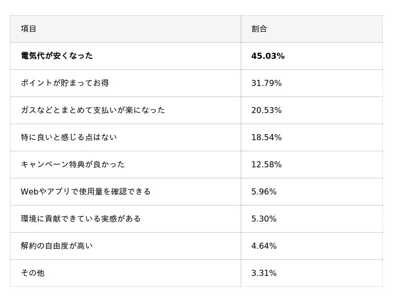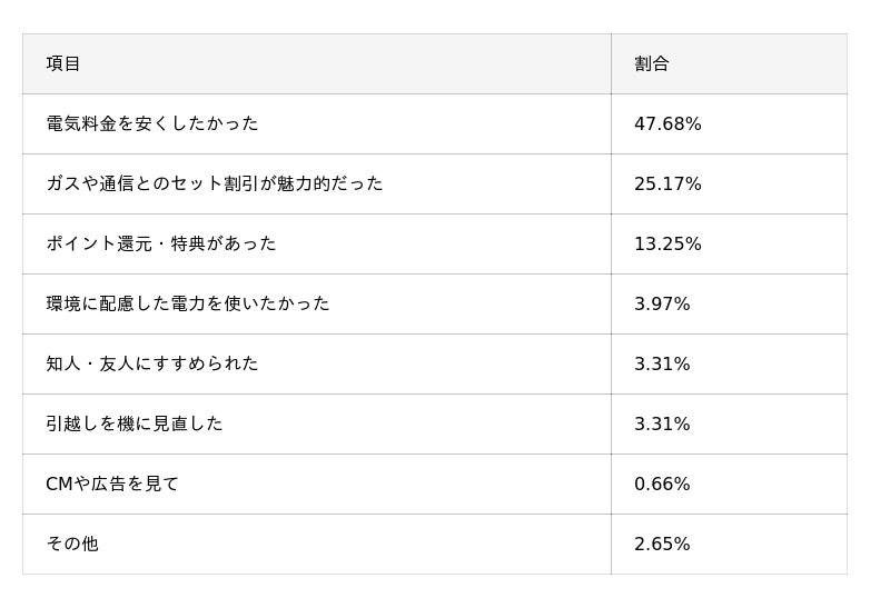 - 乗り換えの理由と、乗り換える電力会社を選ぶ際に最も重視したポイントのどちらも「電気料金を安くしたかった」(47.68%)、「電気料金の安さ」(56.95%)がトップとなり、利用者の最大の動機が電気代の節約にあることが明確になった。