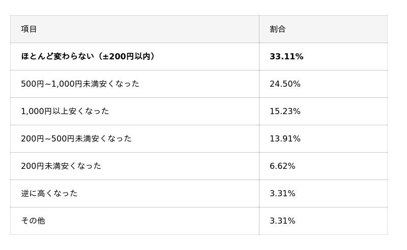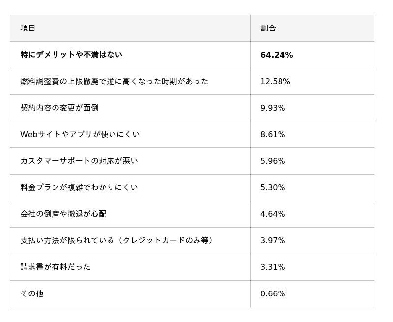 - 利用者の64.24%が「特にデメリットや不満はない」と回答したものの、「燃料調整費の上限撤廃で逆に高くなった時期があった」(12.58%)という回答もあり、一時的な価格高騰に対する懸念も見られた。