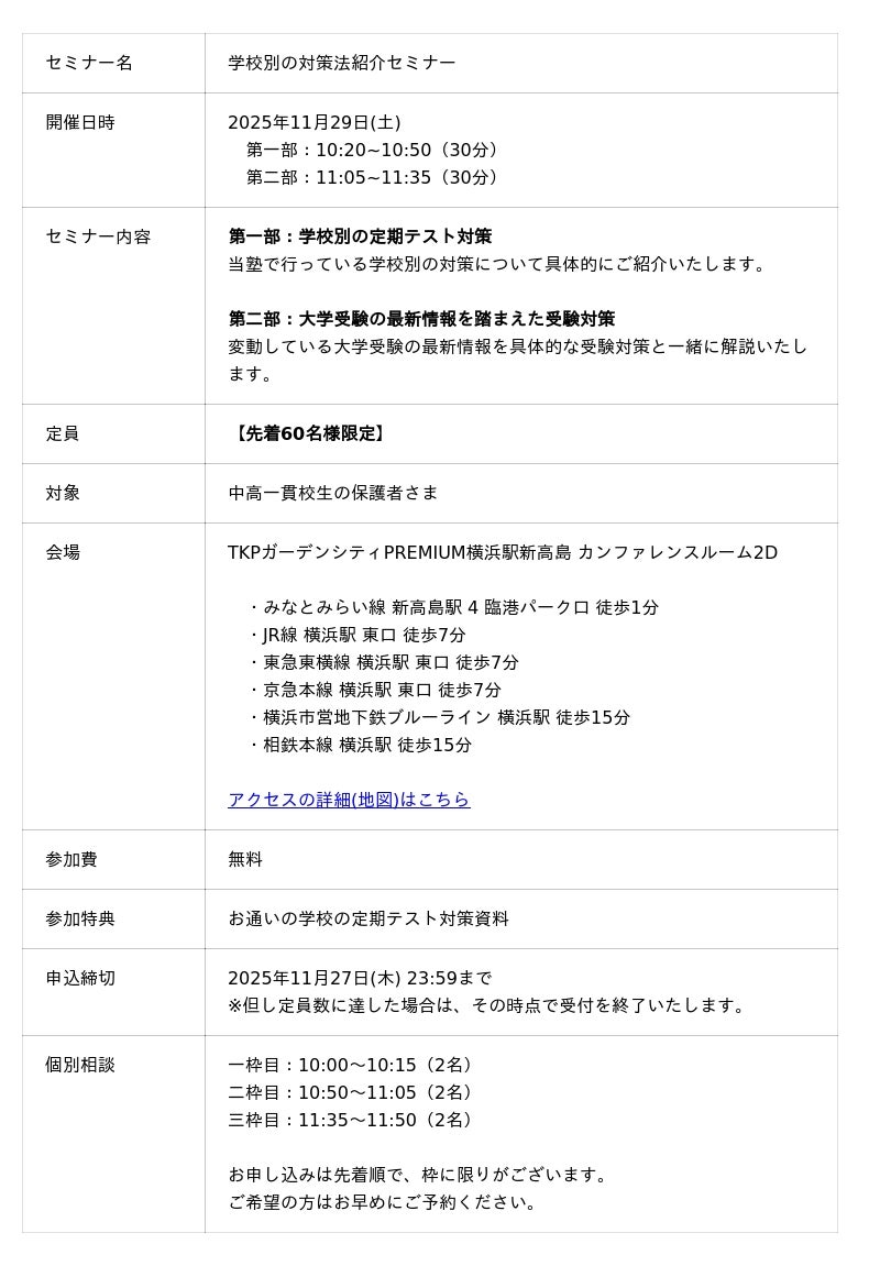 中高一貫校生に向けた「学校別の対策法紹介セミナー」を11月29日(土)に横浜で開催