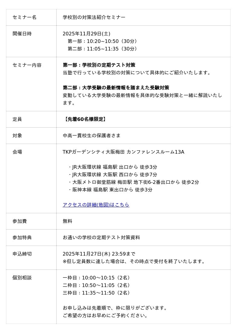 中高一貫校生に向けた「学校別の対策法紹介セミナー」を11月29日(土)に梅田で開催