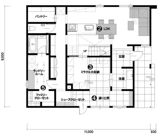 一方“動”の領域である 「ミラクル大収納」 と 「通り土間」 は、車からの荷物をそのまま運び込める収納性と、玄関からランドリーへ短い動線を両立。汚れを気にせず出入りでき、地域の友人を気軽に迎えられる“カジュアルな客間”としての役割も担います。