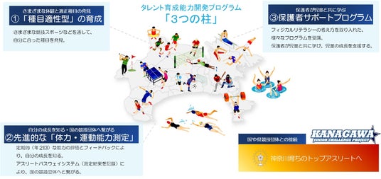 県では、競技スポーツのすそ野拡大や、神奈川育ちのトップアスリートの輩出を目指し、早期からの発掘・育成及び計画的な競技力向上を目的として、ゴールデンエイジといわれる小学4年生から6年生の児童を対象としたタレント発掘・育成事業「かながわジュニアチャレンジプロジェクト」を実施しています。 「スポーツ能力測定会」及び「スポーツ競技体験会」で選考された児童は、トップアスリートを目指す上で必要な基礎的運動技能や知識を身に付けるため、主に小学校5・6年生の約2年間にわたり、様々なスポーツの競技体験や身体能力開発・知的能力開発等の3つの柱を中心とした「タレント育成能力開発プログラム」を受講します。 詳細は県のホームページを御覧ください。