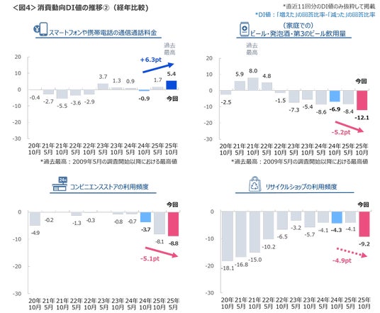 消費動向については、「パチンコ・競馬などギャンブルをする頻度」「動画配信サービスの利用頻度」「スポーツ観戦施設へ行く頻度」「インターネットカフェの利用頻度」といった娯楽や趣味関連の項目が5~10pの低下。「家庭でのビール類の飲用量」「コンビニエンスストアの利用頻度」「リサイクルショップの利用頻度」が5ptの低下。一方「スマートフォンや携帯電話の通信通話料金」は6pt上昇した。本調査で聴取しているその他の消費動向の項目をみると、ややプラスとなったのは「保険料」「クレジットカードの利用金額」のみで、多くは前年同期に比べマイナスや横ばいの傾向。止まらない物価高から依然として消費を抑えようとしている様子がうかがえる。<図3、4>