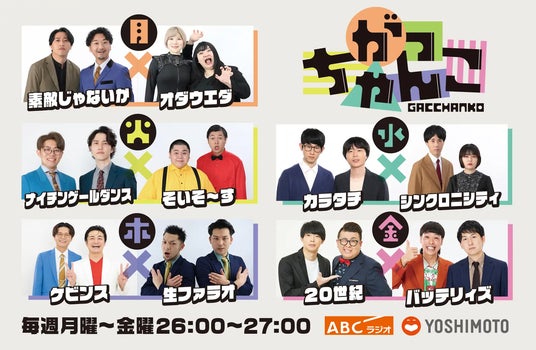 『がっちゃんこ』はABCラジオで毎週(月)~(金)の深夜2時~3時に放送中。毎日2組がレギュラー出演、芸人の個性と個性が『がっちゃんこ』するわちゃわちゃ楽しいお笑いラジオ番組です。番組は放送以外にもApple Podcastを始めとする各種Podcastや、stand.fmでの無料アーカイブ配信も行っています。この機会にぜひお楽しみください!