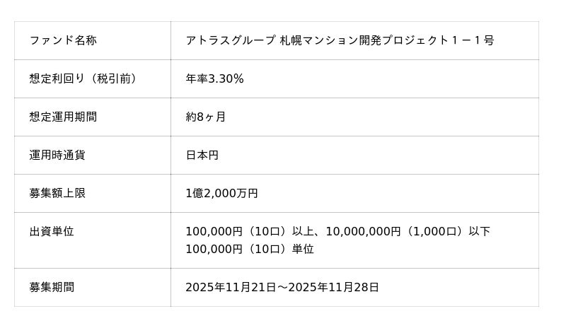 「未来をわかちあう投資」を提供する「Funvest(ファンベスト)」(以下、Funvest)は、「アトラスグループ 札幌マンション開発プロジェクト1-1号」(以下、本ファンド)の募集を11/21より開始しますので、お知らせいたします。