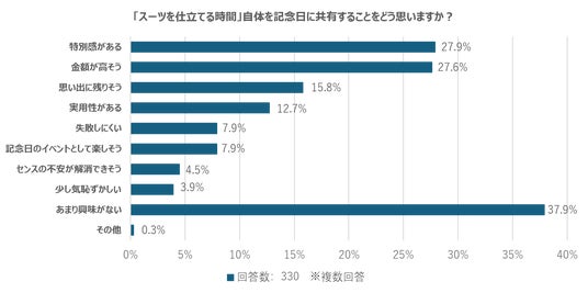 プレゼントの選択肢として、「スーツを仕立てる時間」自体を記念日に共有することに対して、「特別感がある」(27.9%)、「思い出に残りそう」(15.8%)、「実用性がある」(12.7%)とポジティブな意見も。一方「金額が高そう」(27.6%)などの意見も多いこともわかりました。