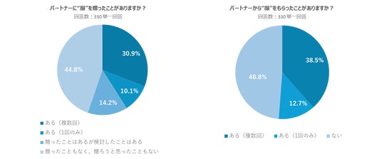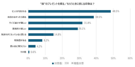 パートナーへのプレゼントの選択肢として、“服”を贈ったことがあるか/もらったことがあるかと質問したところ、約半数以上が「ある」と回答。“服”のプレゼントを贈る/もらうときに感じる印象について、「センスが試される」(48.5%)、「似合わなかったら困る」(38.5%)、「サイズ選びが難しい」(31.8%)などと感じていることが分かりました。