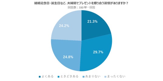 - 半数以上の夫婦が普段からプレゼントを贈り合う習慣があると回答。プレゼントの選定基準は「実用性」が最多。