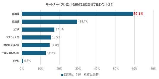 夫婦間でプレゼントを贈り合う習慣について質問をしたところ、「よくある」(21.2%)、「ときどきある」(29.7%)と、結婚記念日・誕生日などのタイミングで半数以上がプレゼントを贈り合う習慣があることがわかりました。プレゼントを選ぶ際に重視するポイントとしては、約6割が「実用性」(59.1%)と回答し、「特別感」(29.4%)が次に多い結果となりました。