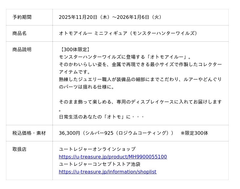 株式会社ユートレジャー(本社:東京都新宿区、代表取締役社長:青木 興一、株式会社ケイ・ウノの連結子会社)は、株式会社カプコンが展開するハンティングアクションゲーム「モンスターハンター」シリーズとコラボレーションした「オトモアイルー ミニフィギュア」の予約受付を2025年11月20日(木)~2026年1月6日(火)の期間、ユートレジャーオンラインショップ、ユートレジャーコンセプトストア池袋にて行います。300体の数量限定です。
