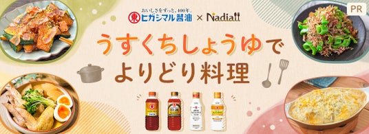 Nadia株式会社(東京都港区/代表取締役社長 葛城嘉紀 以下「Nadia」)とヒガシマル醤油株式会社(兵庫県/代表取締役社長 竹内宏平 以下「ヒガシマル醤油」)がタイアップし、特設企画ページ【うすくちしょうゆでよりどり料理】を公開いたしました。