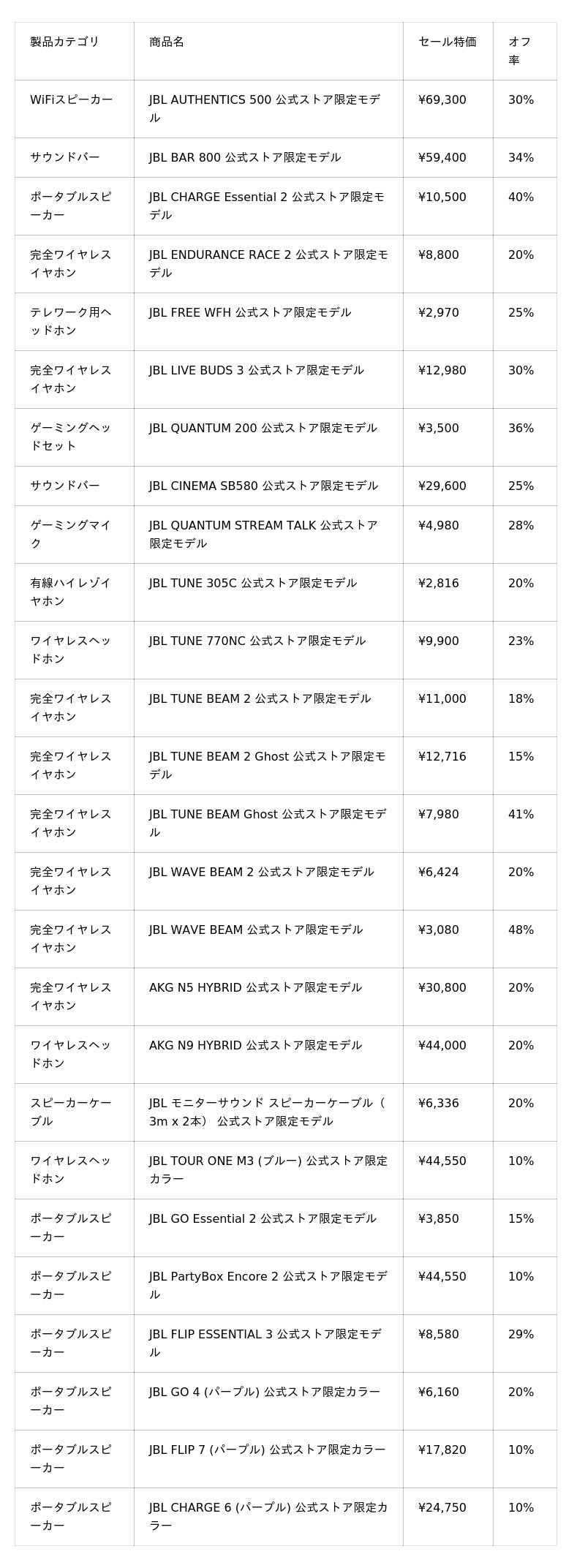 セール対象製品 一部抜粋