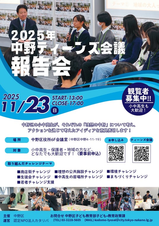認定特定非営利活動法人カタリバ(本部:東京都中野区、代表理事:今村久美、以下カタリバ)は、東京都中野区から受託し、子ども・若者の声を地域づくりに活かす「中野ティーンズ会議」「中野若者会議」に取り組んできました。この度、区長への意見表明や政策提言を行う場として報告会を開催します。