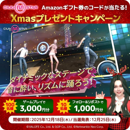 株式会社G・O・P[本社:東京都新宿区、代表取締役社長:申 載明(シン・ジェミョン)]は、PC向けオンラインダンスゲーム『Club M Star』(以下、クラブ・エム・スター)において、2025年11月20日(木)より「Xmasプレゼントキャンペーン」を開催します。