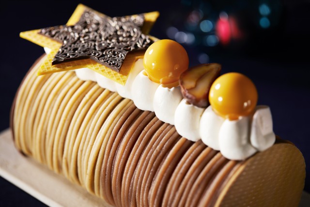 愛媛県産中山栗とフランス産、2種類のモンブランクリームでデコレートしたリッチなブッシュ・ド・ノエルです。和三盆と米粉を使ったもっちりとした食感の生地で、風味豊かなマロンと生クリームを優しく包み込んであります。