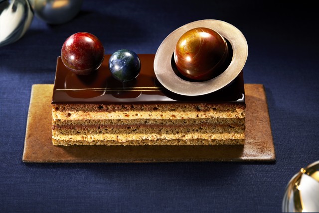 惑星をデザインしたシックな装いのケーキは、ブランデーがほのかに香る大人なテイスト。ほろ苦いチョコレートのガナッシュと香り豊かなほうじ茶のクリーム、シロップをしみ込ませたアーモンド生地が織り成すハーモニーが楽しめます。