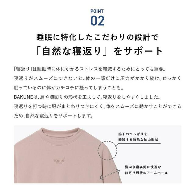 触ると想像以上にやわらかくふんわりした感触で、肌にやさしい着心地。肩や腕まわりなどのパターン設計にも工夫があり、寝返りが自然に打てる構造が採用されています。脇下のつっぱりを軽減する特殊な袖山形状や、横向き寝姿勢に快適な前寄り形状のアームホールなど腕周りに施された工夫が、自然な寝返りをサポートします