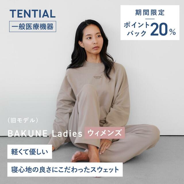 TENTIALの「BAKUNE スウェット ウィメンズ」は、特殊繊維「SELFLAME®」を使って血行を促進。やわらかな肌触りと体温循環効果で、寝ている間の疲労回復をサポートする贅沢なリカバリーウェアが、20%ポイントバックとお得に購入できるチャンスです。