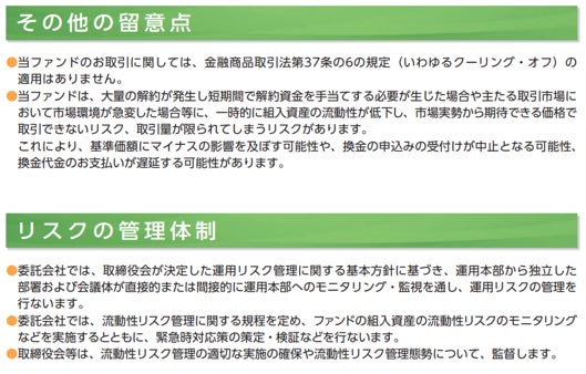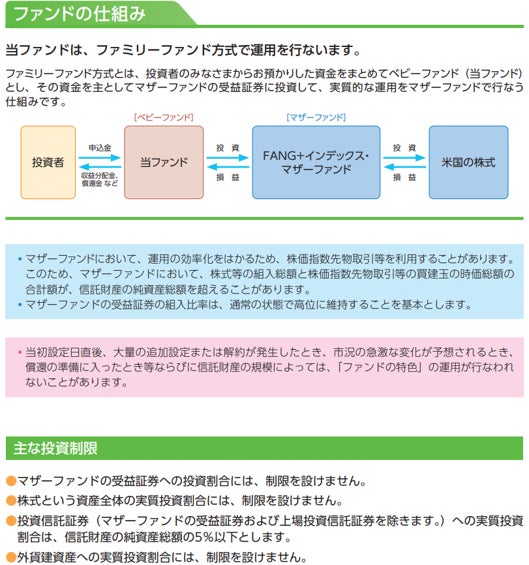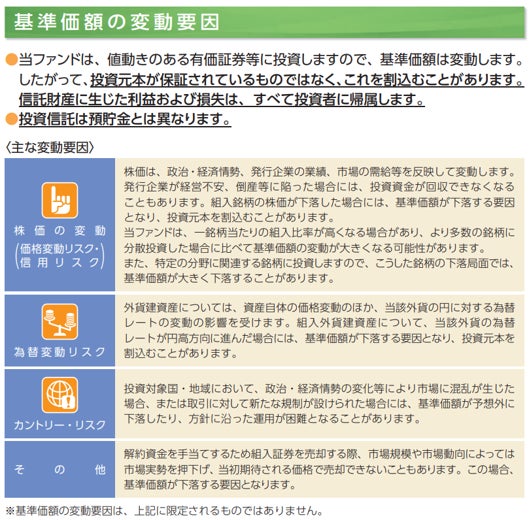 - 投資信託は値動きのある有価証券等に投資しますので、基準価額は大きく変動します。したがって、投資元本が保証されているものではありません。信託財産に生じた利益および損失はすべて投資者に帰属します。投資信託は預貯金とは異なります。