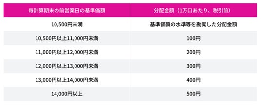 計算期末の前営業日(申込受付中止日の場合、計算期末の前々営業日)の基準価額に応じて、下記の金額の分配をめざします。