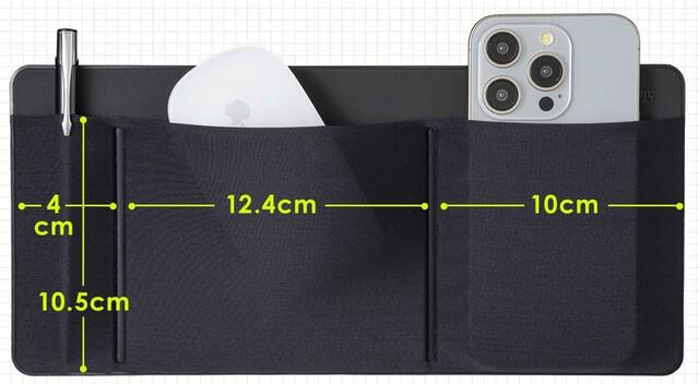 3つのポケットはそれぞれサイズが違うので、ペンやケーブルを入れるゾーン、マウスやかさばるものを入れるゾーン、スマホやノートを入れるゾーン……と使い分けるのがよさそう。