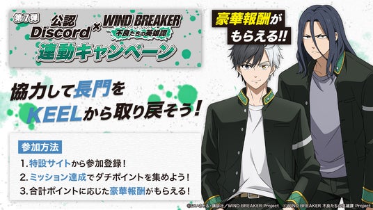 Discordコミュニティの企画・運営支援を行うナイル株式会社(本社:東京都品川区、代表取締役社長:高橋飛翔、以下ナイル)は、株式会社講談社(本社:東京都文京区、代表取締役社長:野間省伸)が提供するTVアニメ『WIND BREAKER』を題材としたオンラインゲーム『WIND BREAKER 不良たちの英雄譚』(略称、『ウィンヒロ』)とWIND BREAKER 総合コミュニティによる第7弾連動キャンペーン「協力して長門をKEELから取り戻そう!」を2025年11月21日(金)より開催いたします。