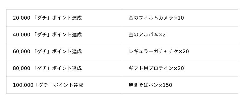 各ミッションをクリアすると「ダチ」ポイントが蓄積され、ポイントの累計が一定値を超えるごとに報酬が追加されていきます。みんなで協力して全ての報酬を獲得しよう!