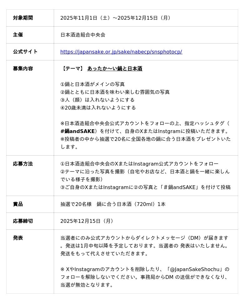 ユネスコ無形文化遺産に登録された「伝統的酒造り」に関わる日本酒業界最大の団体である日本酒造組合中央会(以下、中央会)では、日本酒と鍋を一緒に楽しむ様子を撮影し、ハッシュタグ「#鍋andSAKE」をつけてXまたはInstagramに投稿すると抽選で20名様に鍋に合う日本酒(720ml)1本があたるSNS投稿キャンペーン「鍋&SAKEキャンペーン」を11月1日(土)から12月15日(月)までの期間実施しております。