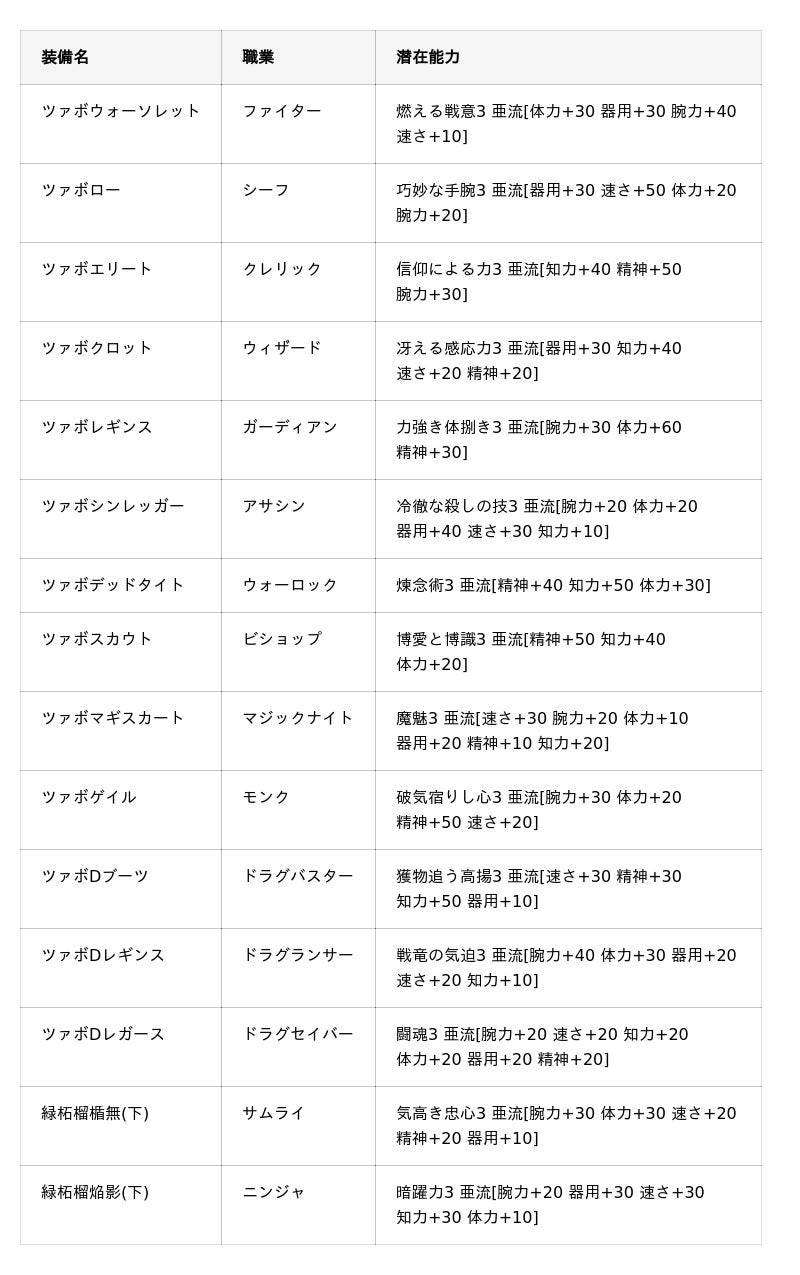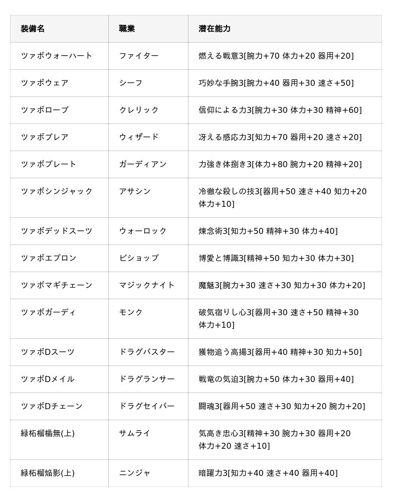 ※「ツァボシリーズ」の合成には、該当職業の「ドロミティ」装備 を素材として使用します