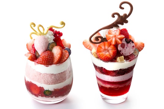 やさしい甘さ、ベリーのきゅんとした酸味など、異なるパーツが重なり合い、ひとつのデザートを仕立てています。パフェ、プレートデザート、グラスデザート、ワッフル、ドリンクと、どのかたちもベリーの魅力が息づいています。