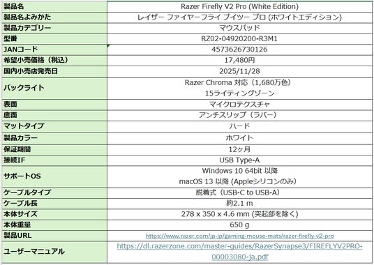 ゲーマー向けライフスタイルブランドとして世界をリードするRazer(TM)(本社:米国カリフォルニア州およびシンガポール)の日本法人Razer Japan株式会社は、バックライト機能を搭載したマウスパッド新製品Razer Firefly V2 Pro (White Edition)を2025年11月28日に発売します。希望小売価格は17,480円(税込)です。日本国内の家電量販店、PCショップ、オンラインショップ等でご購入いただけます。