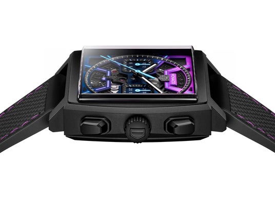 わずか600本のリミテッドエディションのこのモデルは、それぞれに個別のシリアル番号が刻印されています。また、タイムピースに使われているのと同じパープルでアクセントを効かせた特別デザインの「タグ・ホイヤー モナコ」の専用パッケージに収められています。
