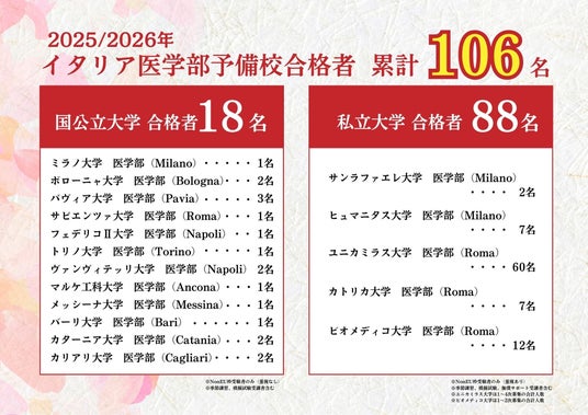 イタリアの英語医学部進学を専門とする「イタリア医学部予備校」(運営:MED ITALY株式会社/本社:東京都港区、代表取締役:近藤晋一郎)は、2025年のイタリア医学部入学試験において日本人合格者106名(国公立18名、私立88名)を輩出することができました。この結果は、当校が提供する国際的な視野に立った教育プログラムと、生徒一人ひとりに対する徹底したサポート体制の成果であり、日本のイタリア医学部進学実績として過去最高(当校調べ)の合格者数となります。