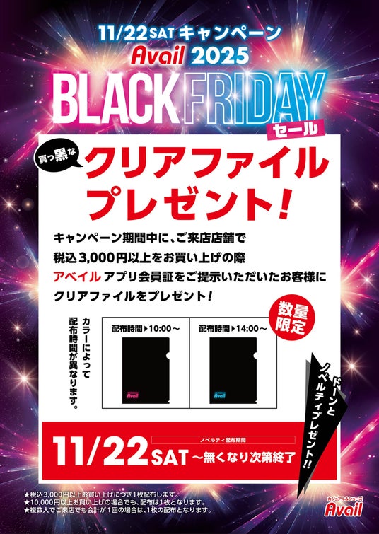 11/22(土)より、店舗で税込3,000円以上お買い上げのうえ、アベイルアプリの会員証をご提示いただいたお客様を対象に、アベイルオリジナルのクリアファイル(1枚)を数量限定でプレゼントします。なくなり次第終了となります。