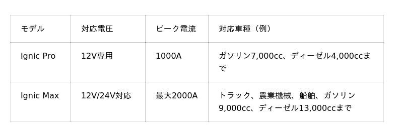 「Ignic」は、乗用車だけでなく、様々な車両に対応できるよう2モデルを展開。極度に電圧が低下したバッテリー(5V以下)に対応できる「BOOSTモード」も搭載!