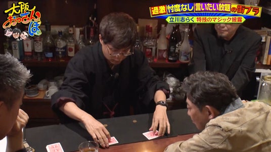 次に一行が立ち寄ったのは、北新地では老舗のマジックバー「ミストフェリーズ」。オーナーのリチャード・シブヤさんはこの道50年以上の有名マジシャンで、さっそくマジックを体験。次々と繰り出されるカードマジックに驚くおっさんたち。