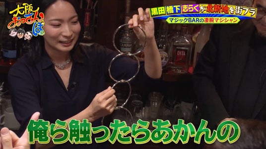 続いて、オーナーの弟子でもあるSUZYさんは金属の輪っかを使ったリングマジックを。切れ目がないのに繋がったり離れたりをする輪っかに興味を持った黒田が「触らせてよ、頼むわ」と懇願するが、「音声だけで聞いたら変態やな」と苦笑い。