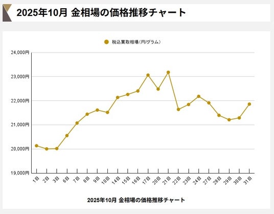 令和7年10月1日(水)の金相場は1gあたり20,133円からスタート。米政府機関の一部閉鎖や国内の自民党総裁選の結果による円安と株高の加速により6日から7日の2日間で1,000円以上の反発。翌週には米中貿易摩擦が再熱したことから金相場は一気に22,000円まで上昇します。この後も追加利下げへの期待も加わったことで10月17日(金)には23,000円を突破し、21日(火)には10月では最高値の23,179円を記録しました。今後は23,000円を推移していくかと予想されていた中、翌日の22日(水)は前日比で過去最大となる1,540円の大幅下落を記録。ドル高への懸念やおよそ2週間のうちに3,000円以上の値上げに見切りをつけた利益確定売りが起こした大暴落でした。10月の最終は1gあたり21,860円にて終了。怒涛の如く乱高下をみせた金相場は、テレビ報道やインターネットニュースで取り上げられました。今後は12月に予想される追加の利下げや台湾存立危機事態について米中関係が再び対立していくかが金相場に影響を及ぼす可能性があります。