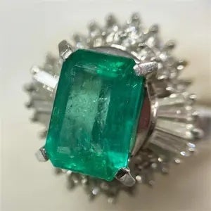 エメラルドE(5.41ct メレダイヤ MD(1.00ct Pt900 リング5ctを超えるエメラルドのリングです。エメラルドの産地は主にコロンビア、ブラジル、ザンビアです。コロンビアは世界のおよそ80%以上の採掘量となっています。ダイヤ相場の下落と比べて色石はまだまだ根強い人気とみえます。