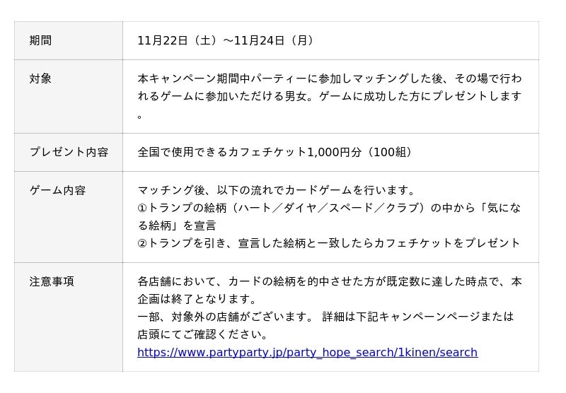 国内最多*¹の成婚数を誇る株式会社IBJ(代表取締役社長:石坂茂、本社:東京都新宿区、東証プライム:6071)が運営する婚活パーティーサービス「IBJ Matching(IBJマッチング)」は、「PARTY☆PARTY」からサービス名を変更して1周年が経ったことを記念し、2025年11月22日(土)から24日(月)の3日間、1,000円分のカフェチケットをプレゼントするキャンペーンを実施します。期間中にパーティーに参加しマッチングした男女で、カードゲームに挑戦し成功した100組に進呈します。
