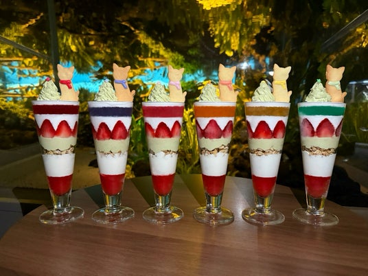 「Collarソラネコパフェ」自家製のいちごジャムやピスタチオクリームを贅沢に使用したパフェに、カラーが異なるクラッシュゼリーとネコクッキーをあしらった一品。